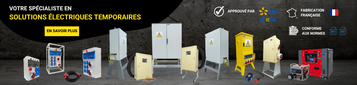 Avec plus de 15 ans d’expertise dans le domaine, THERM ELEC est devenu une référence dans la vente en ligne de coffret de chantier, compteur et coffret de branchement de chantier pour vos installations électriques provisoires. Notre gamme complète de coffret de chantier, compteur et coffret de branchement de chantier est 100% conforme aux normes en vigueur NF C15-100 / NF C14-100 et approuvée par les services EDF / ENEDIS. L'ensemble de nos coffrets de chantier sont :